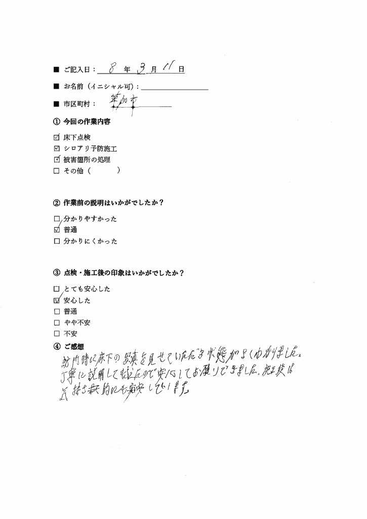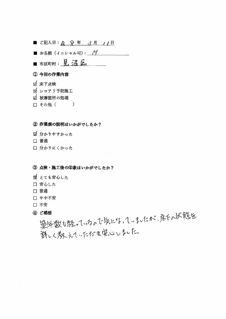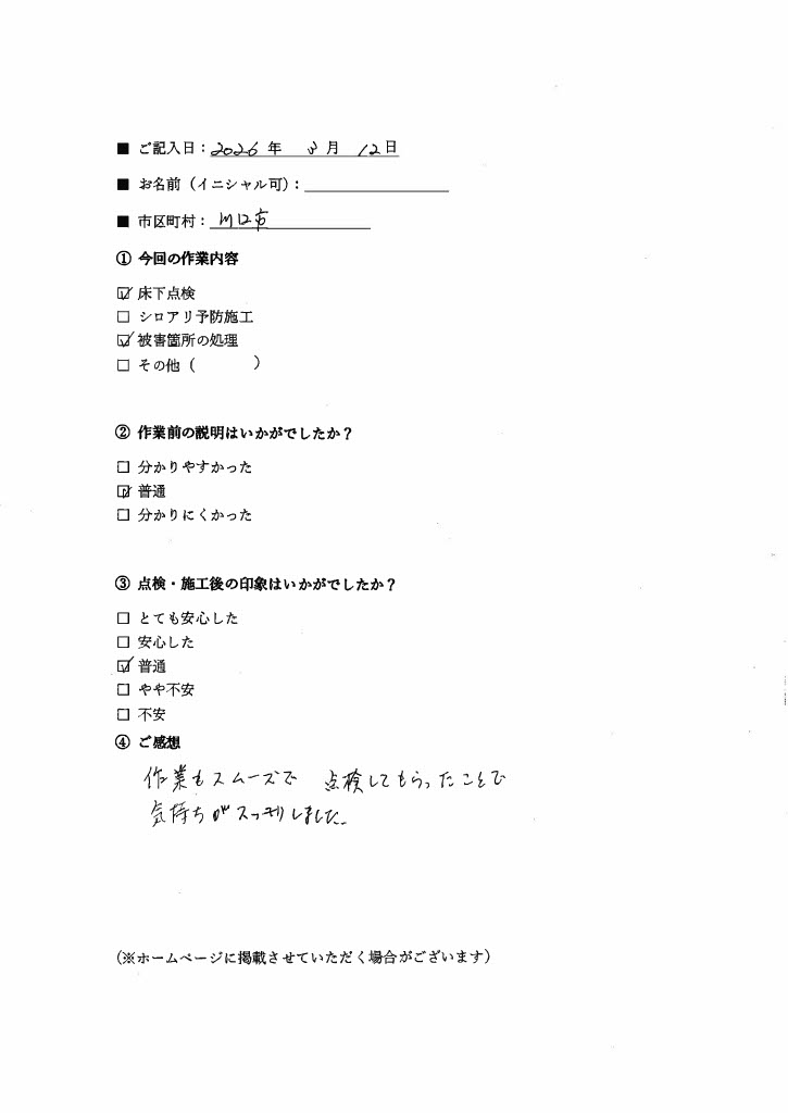 ※シロアリ駆除・配管クリーニングを含む、当社の施工をご利用頂いたお客様の声です。
