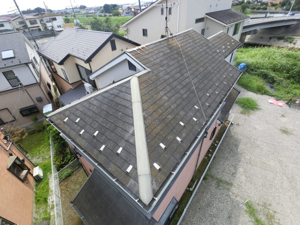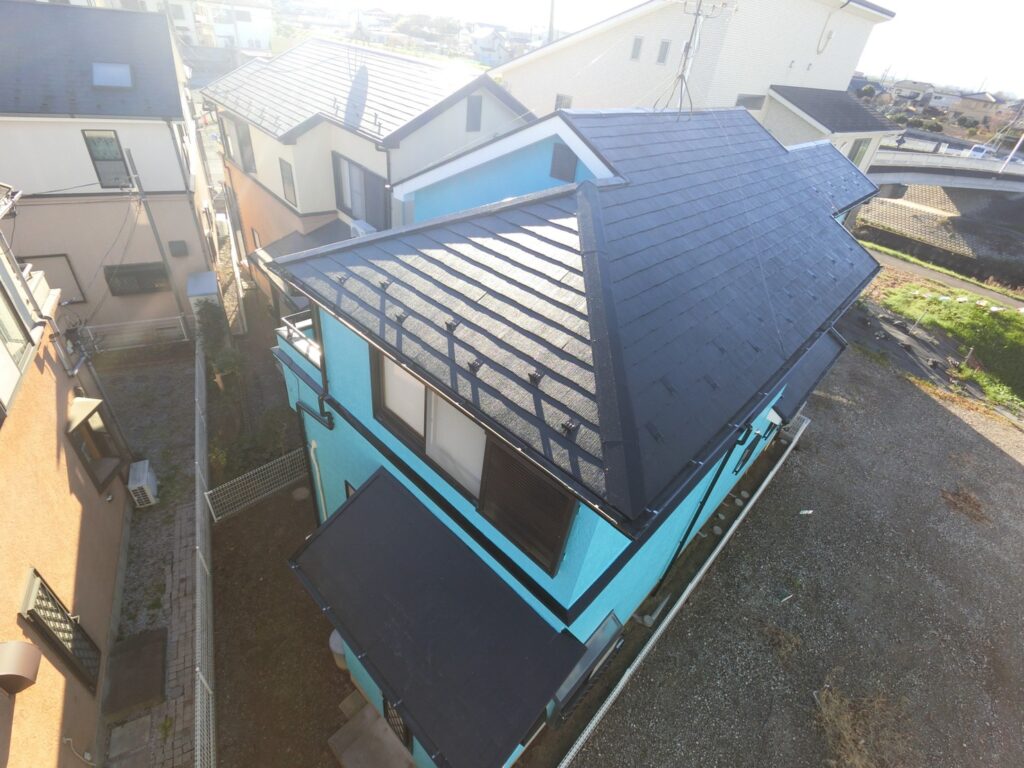 屋根は落ち着いた濃色で塗装し、外壁とのコントラストをつけることで全体を引き締めています。